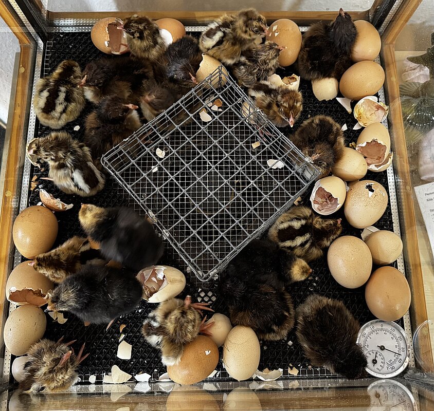 Leise piepsend und dicht gedrängt hocken frisch geschlüpfte Hühnerküken in ihrem Brutkasten. Aufgeregt tapsen sie mit wackligen Schritten durch den Inkubator. Manche sind gestreift, andere fast schwarz oder dunkelbraun mit weißem Bauch.