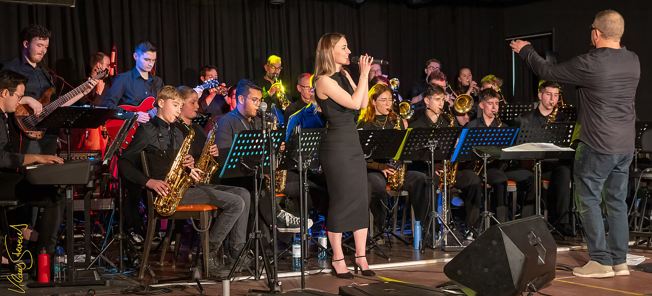 Nach der Pause übernimmt die Big Band die Bühne. Das Ensemble besteht aus ca. 20 aktuellen und ehemaligen Schülerinnen und Schülern des Gymnasiums Jüchen. Für eine große Altersspanne in der Band ist also von vornherein gesorgt. Einige der jungen Musikerinnen und Musiker leben, studieren und arbeiten mittlerweile in Essen, Köln oder Aachen. So entspricht die Bandzusammensetzung, ergänzt um die stilistische Bandbreite, letztlich der Grundidee von Bigband-Jazz: Als Gruppe kreativ sein, dabei aber so heterogen, individuell und spontan wie möglich bleiben.