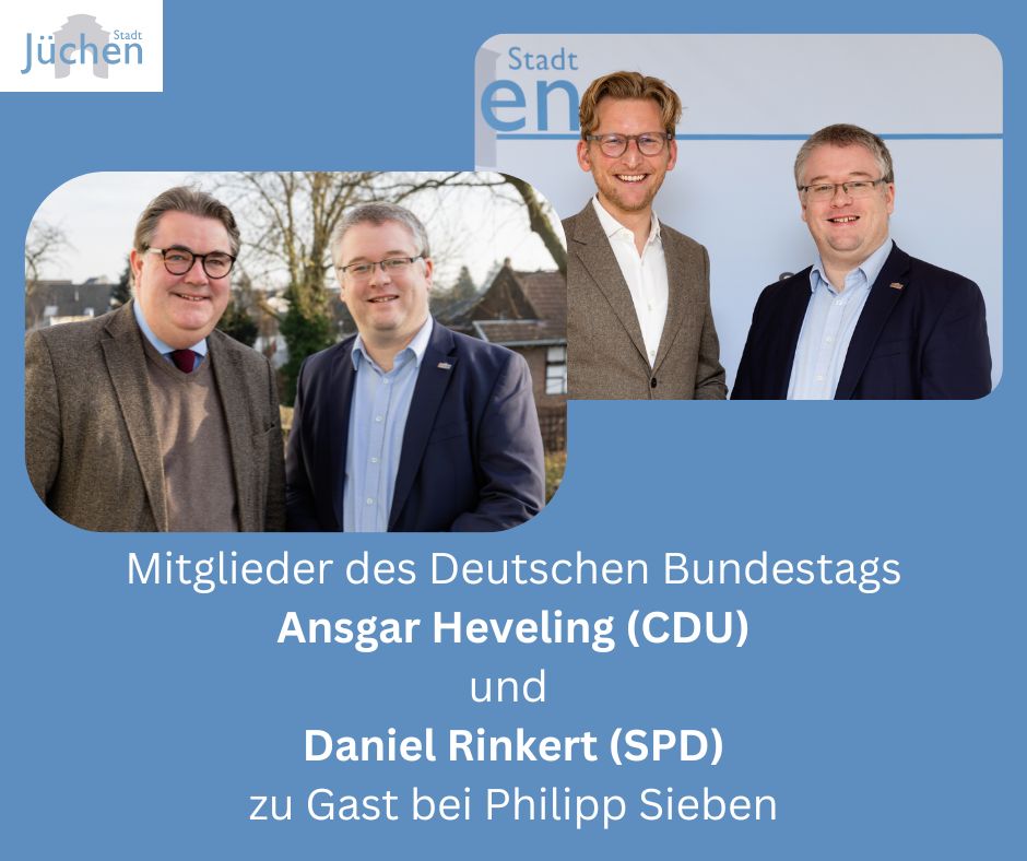 „Ich freue mich, dass Ansgar Heveling und Daniel Rinkert meiner Einladung gefolgt sind. Durch den persönlichen Kontakt nach Berlin können wir die Zusammenarbeit stärken, so dass die Belange Jüchens auch im Bundestag besser Gehör finden. Es ist mir ein zentrales Anliegen, parteiübergreifend mit den demokratischen politischen Kräften zu sprechen“, erläutert Philipp Sieben.