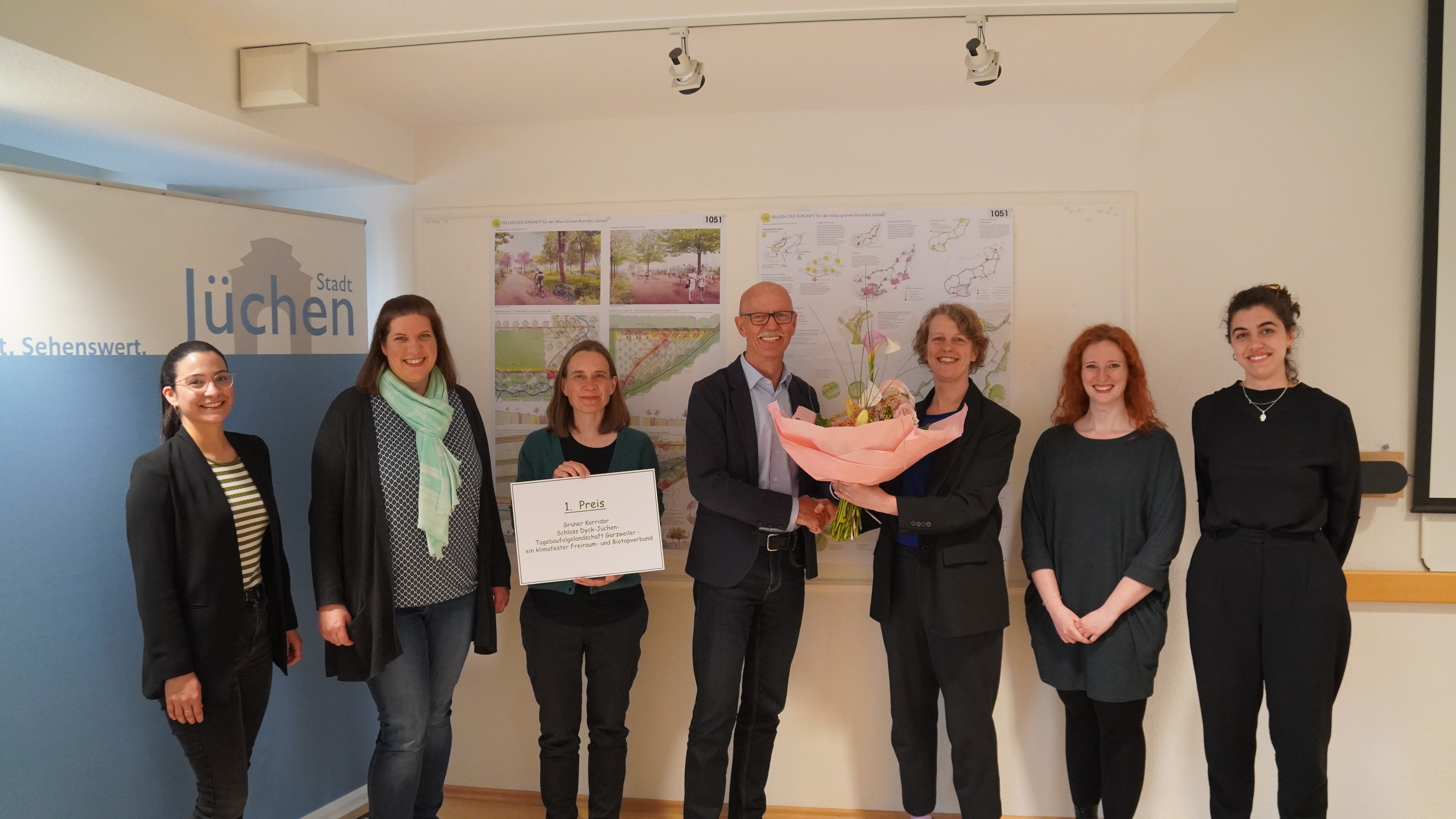 In Anbetracht der vielfältigen Anforderungen ist das Projekt sehr spannend aber auch komplex. Für die Planung der Maßnahmen möchte die Stadt Jüchen ein Landschaftsarchitekturbüro beauftragen. Dazu wurde ein nichtoffener, einphasiger Wettbewerb durchgeführt, der durch das Büro ISR – Innovative Stadt- und Raumplanung GmbH begleitet wurde. Insgesamt wurden elf Entwürfe eingereicht, die am 18.04.2024 im Rahmen einer Preisgerichtssitzung bewertet wurden. Den ersten Preis gewann der Entwurf des Büros JUCA Landschaft und Architektur, Brücker Fickinger Partnerschaft mbB aus Berlin. Ausschlaggebend waren in dem Entwurf vielfältige Landschaftsbausteine, die den vorgefundenen Raum mit neuen Qualitäten an den richtigen Stellen anreichern. Der bisher überwiegend linear strukturierte Raum wird in dem Entwurf durch viele Elemente aufgeweitet und vielfältig erlebbar gemacht.