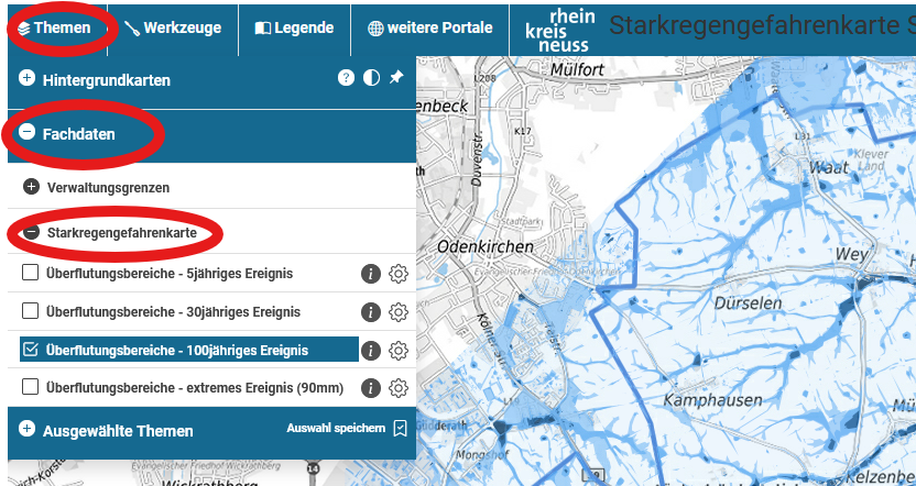 Wenn Sie die Starkregenkarte aufgerufen haben, können Sie im Menü über “Themen” → “Fachdaten" → “Starkregengefahrenkarte" die Daten für verschiedene Ereignisse einblenden lassen (siehe Screenshot).